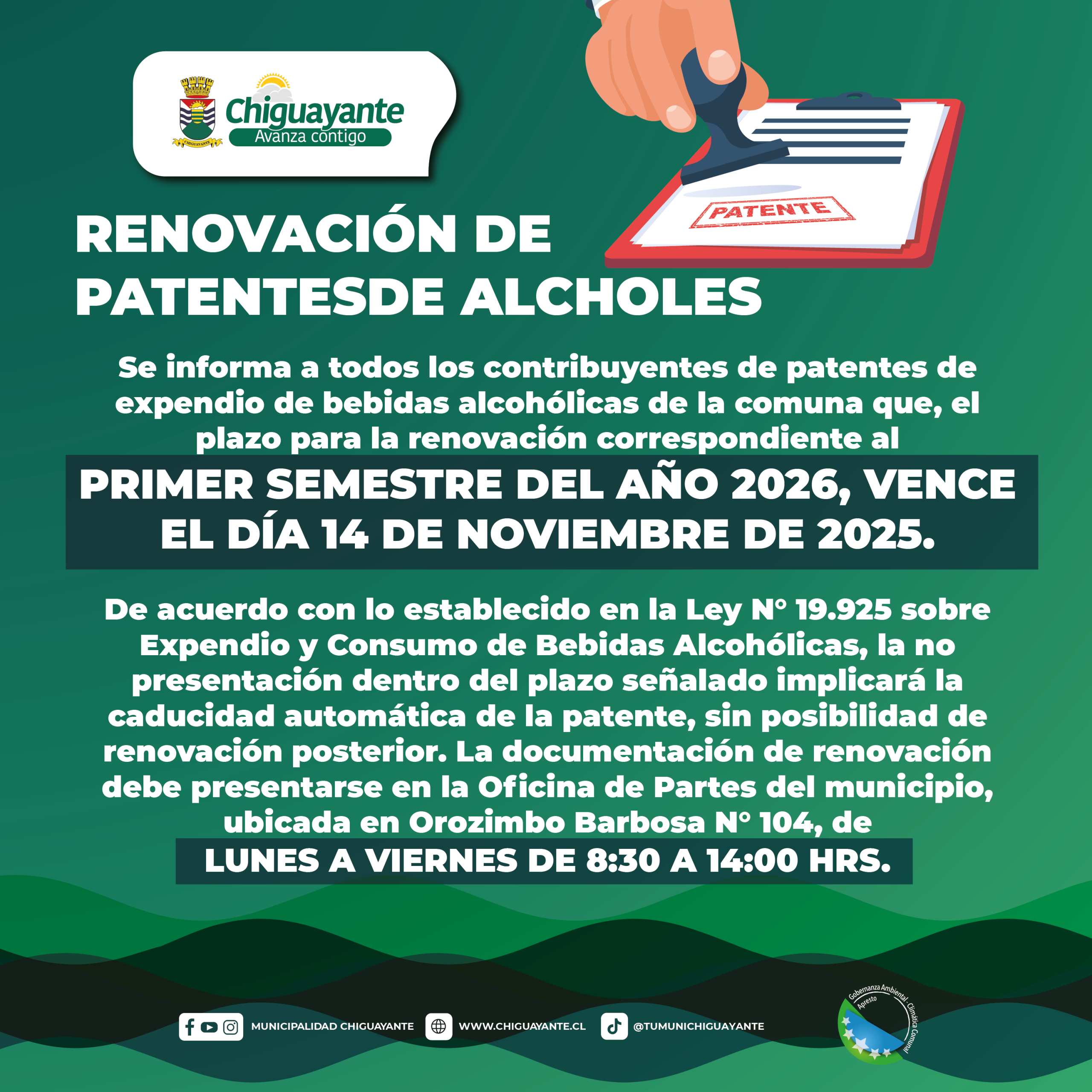 La renovación de patentes de expendio de bebidas alcohólicas correspondientes al primer semestre del año 2026 vence el 14 de noviembre de 2025.