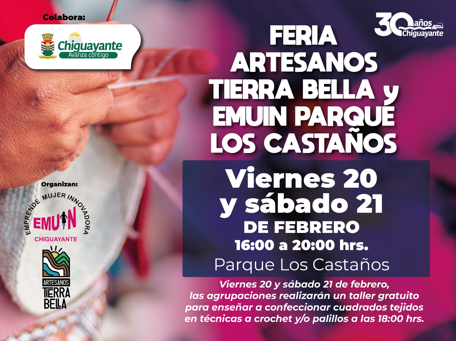 Vecinas y vecinos, los invitamos a participar en una nueva edición de la Feria de Artesanos Tierra Bella y EMUIN, que se realizará este viernes 20 y sábado 21 de febrero, entre las 16:00 y las 20:00 horas, en el Parque Los Castaños. Será una instancia para conocer y apoyar el trabajo de artesanas y artesanos locales, quienes ofrecerán productos elaborados de manera manual, fortaleciendo la economía local y el valor de los oficios tradicionales.